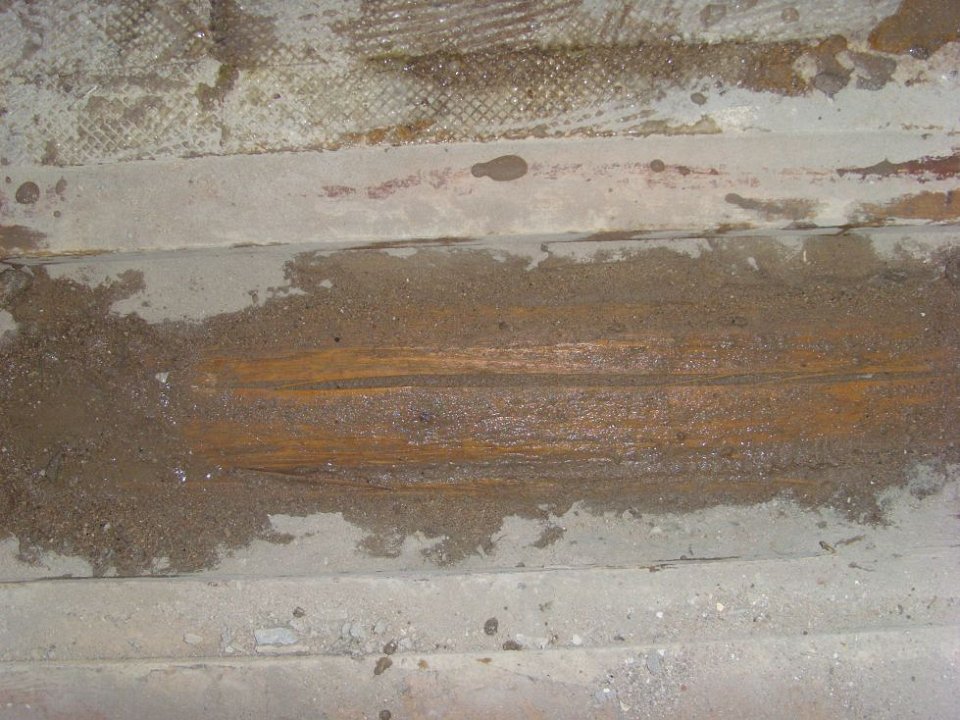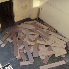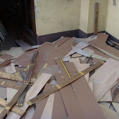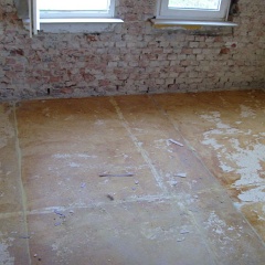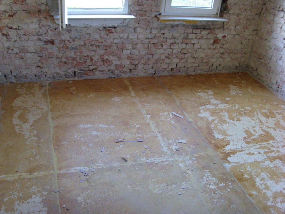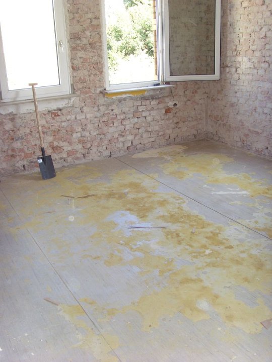 3 Bodenbelag Nr. 3 - Spanplatten auf den alten Dielen verklebt, vernagelt und verschraubt |