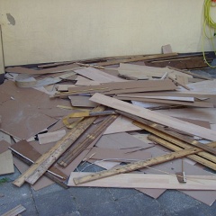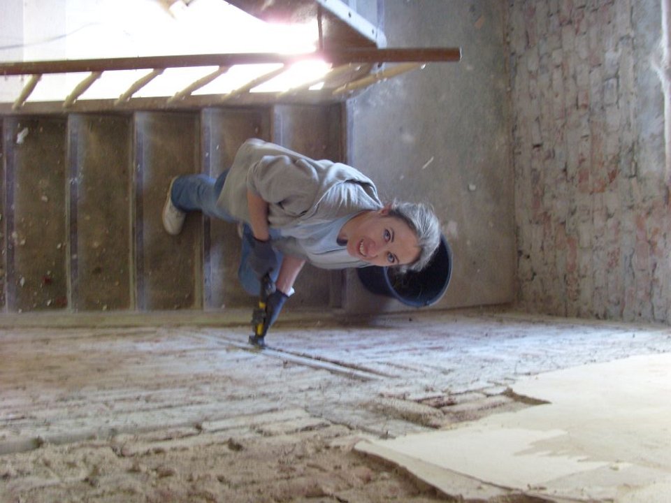 44 Ganz toll, Spanplatten auf den Dielen mit Ausgleichsmasse verklebt und verschraubt |