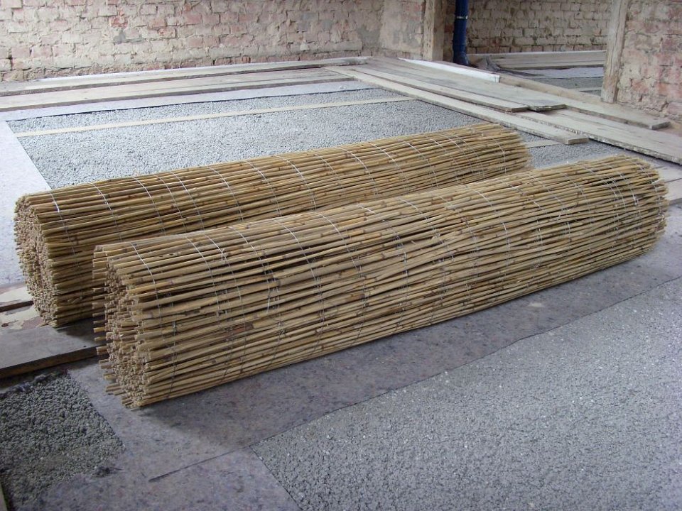2 Links unten Holzfaserplatten, darüber Schilfrohrmatten, oben drauf Hanf, dann nach rechts die Big Packs mit Lehm-Unterputz und Lehm-Oberputz. |