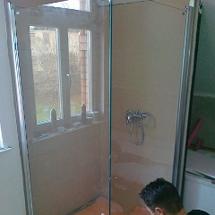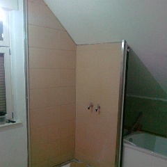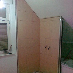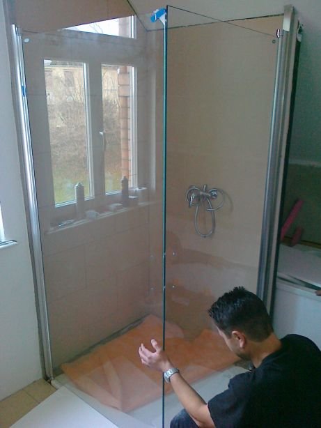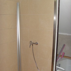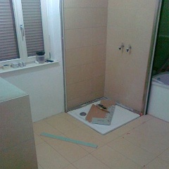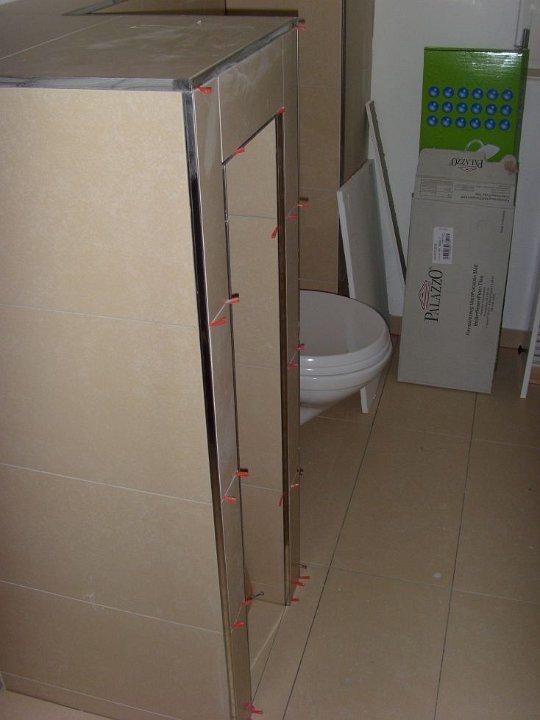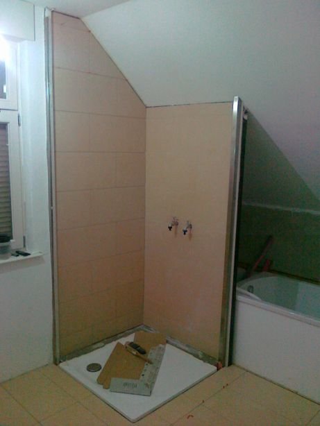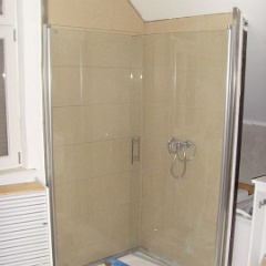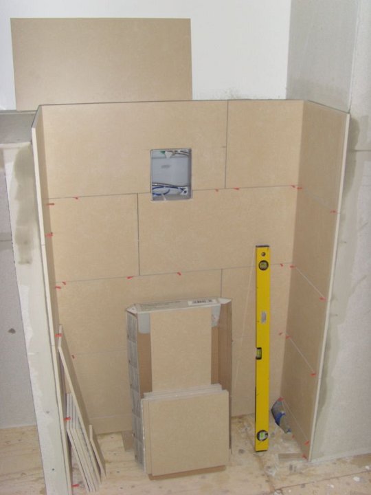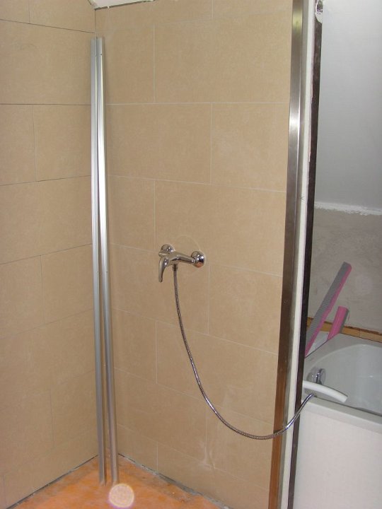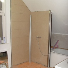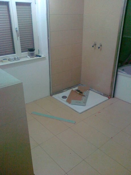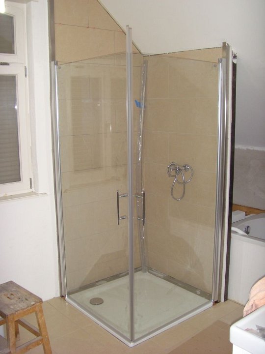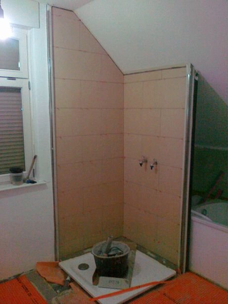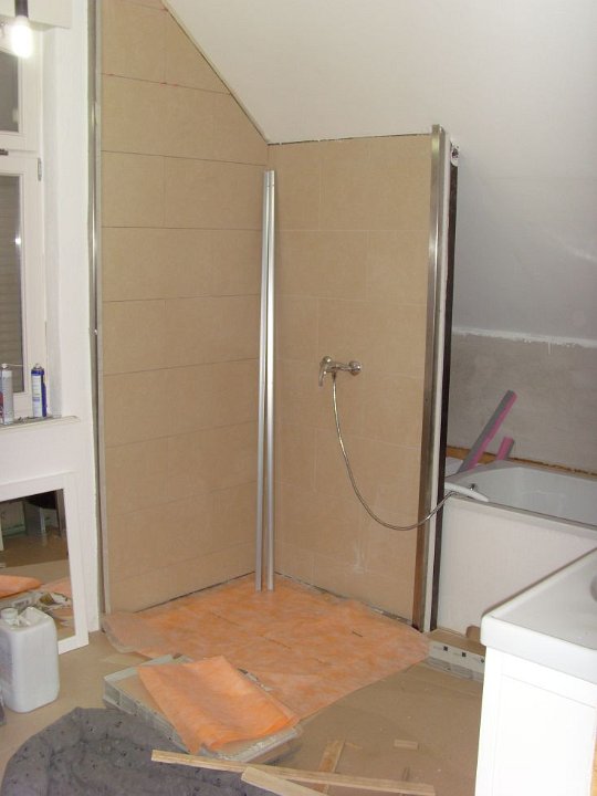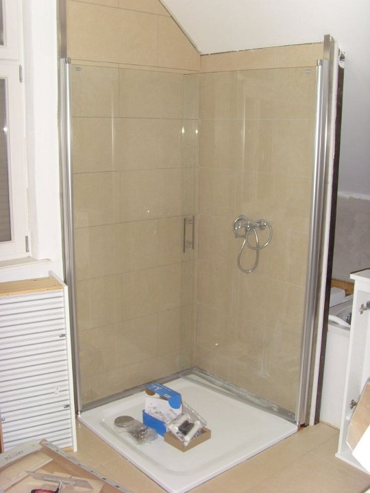 58 Sieht geht zu, aber nicht paßgenau über der Duschtasse. Der Fliesenleger muss noch abdichten, mal sehen, ob der noch kommt.