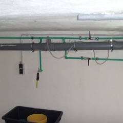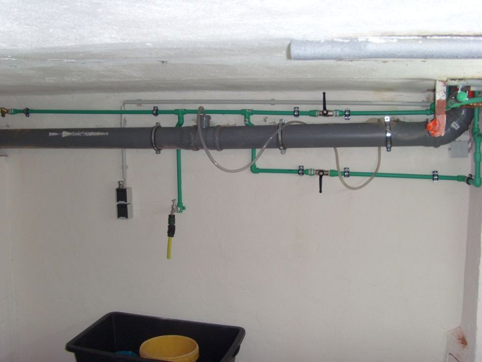 3 Jetzt hat die Waschmaschine ihren Platz, die schwarzen Hebel sind für Warm- & Kaltwasser, links geht's zum Aussenwasserhahn.