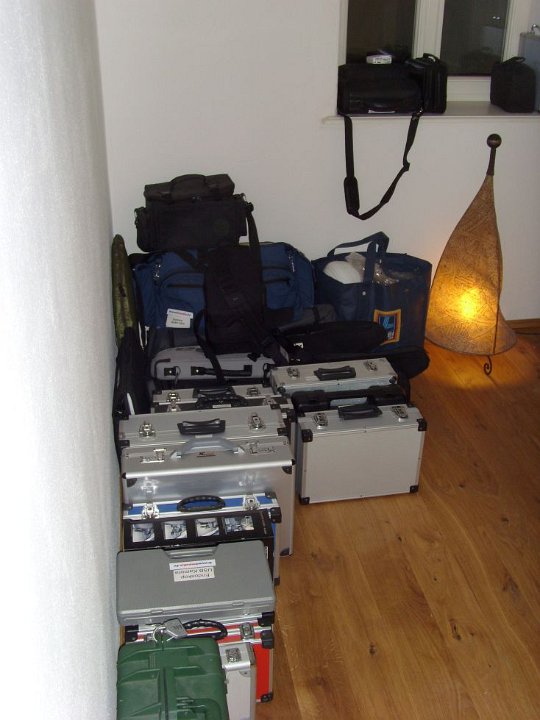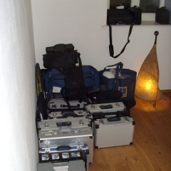 46 Der Koffer mit Internet-fähigen Überwachungskameras, ein Beamertisch und eine Ecke des Behelfs-Schreibtisches.