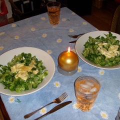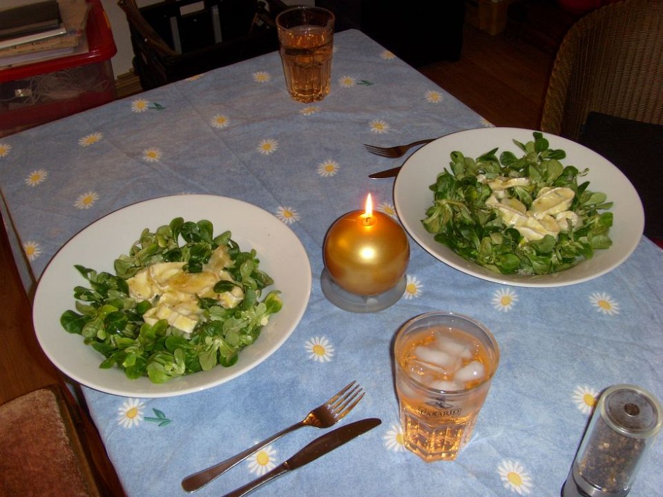 93 Das gesunde Weihnachtsessen, Feldsalat (österr.: Vogerlsalat) mit in Olivenöl gebratenem Ziegenkäse. Dazu Wasser mit Geschmack und den ersten eigenen Eiswürfeln.
