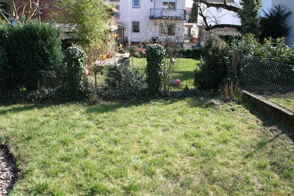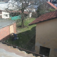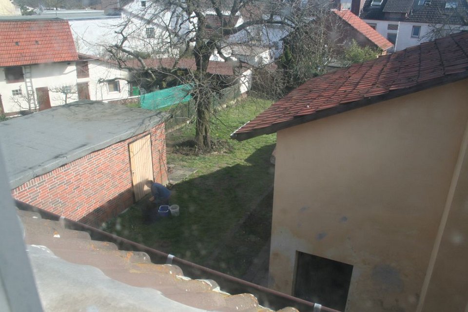 46 Blick durch ein dreckiges Fenster nach Süden auf's Grundstück |