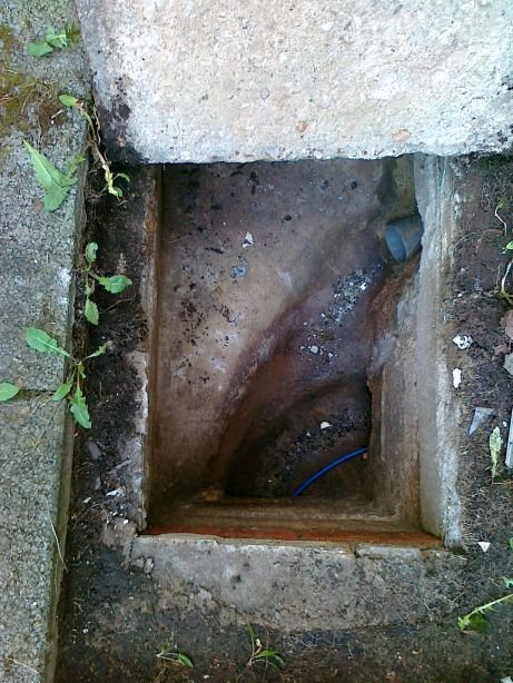 21 Neues Fundstück, ein Revisionsschacht des Abwasserkanals, das Blaue ist ein Kamerakabel. |
