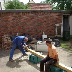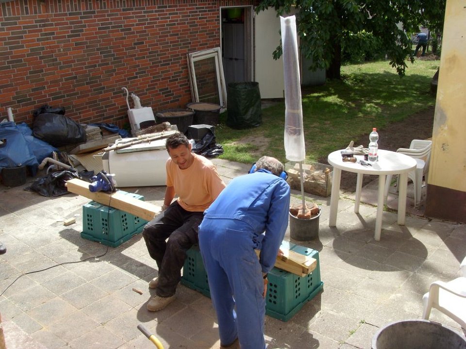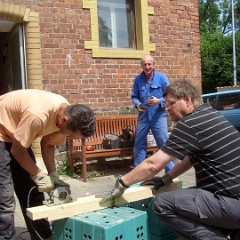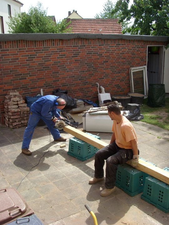 Elvir, Rainer und Alexander basteln den Balken zurecht.