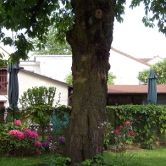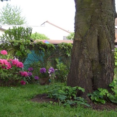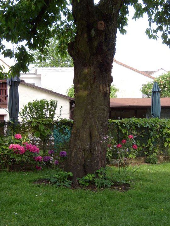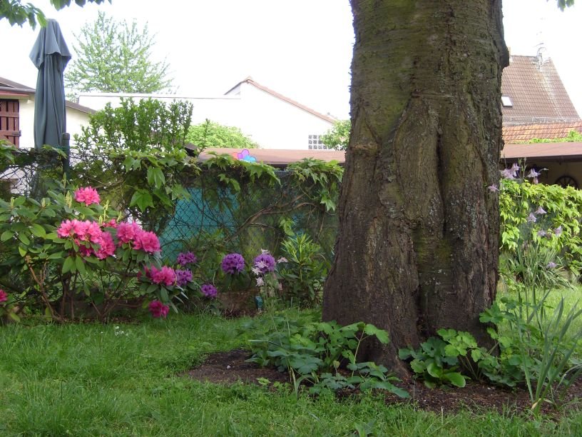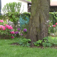 12 Man achte auf die Akeleien (zartrosa) rechts vom Kirschbaumstamm. |