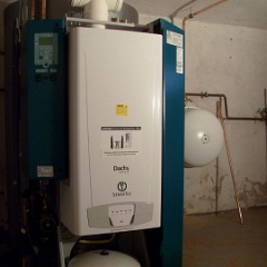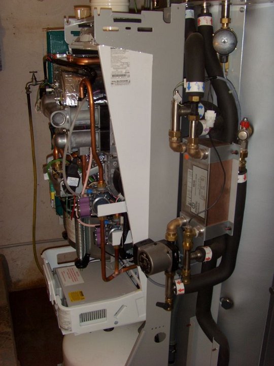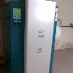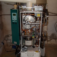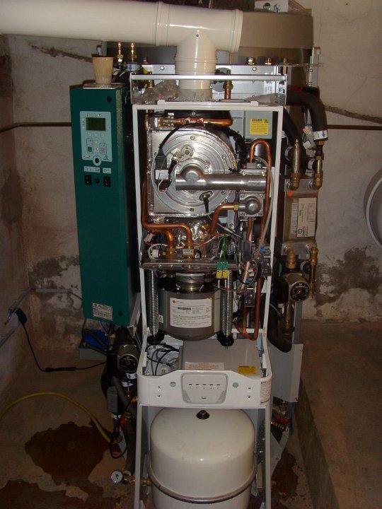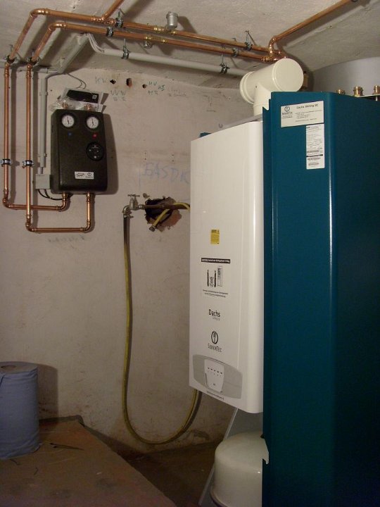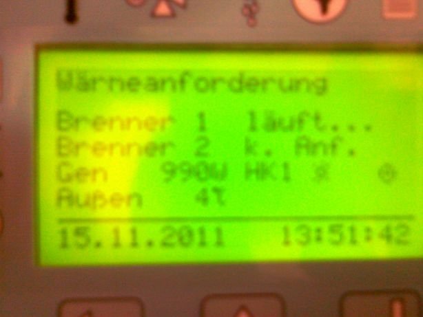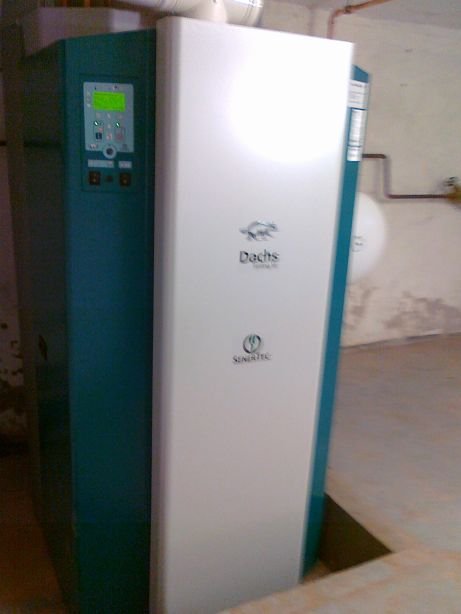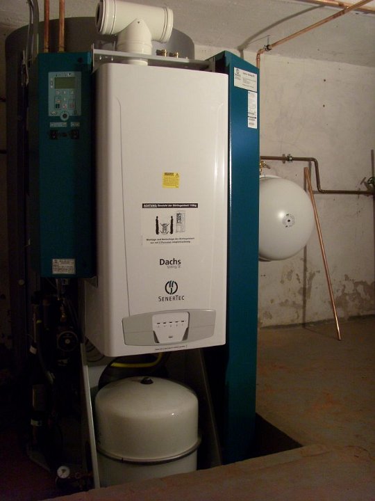 3 Kurz zurück zum DACHS, der ist fast fertig montiert. Links oben das hellgrüne Bedienfeld, das weiße T-Stück ist Abgas- und Zuluftrohr zugleich. |