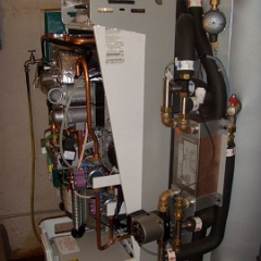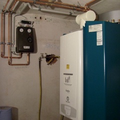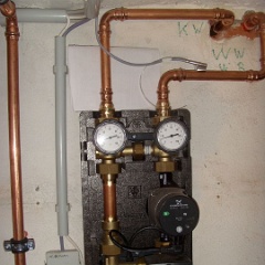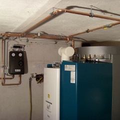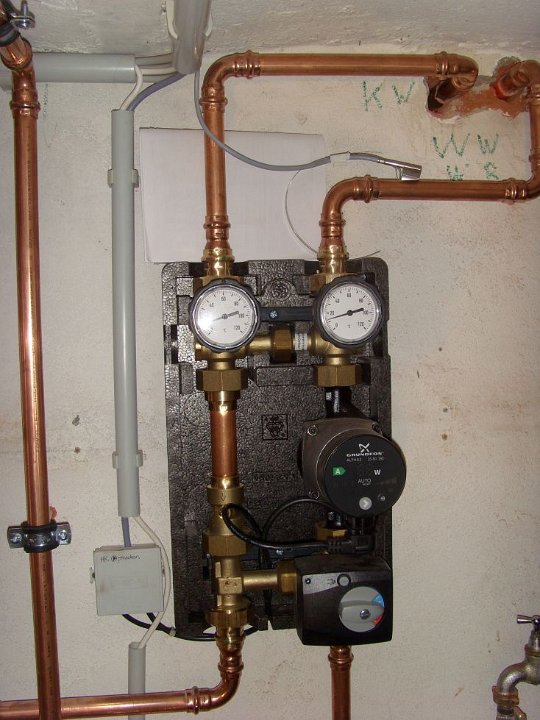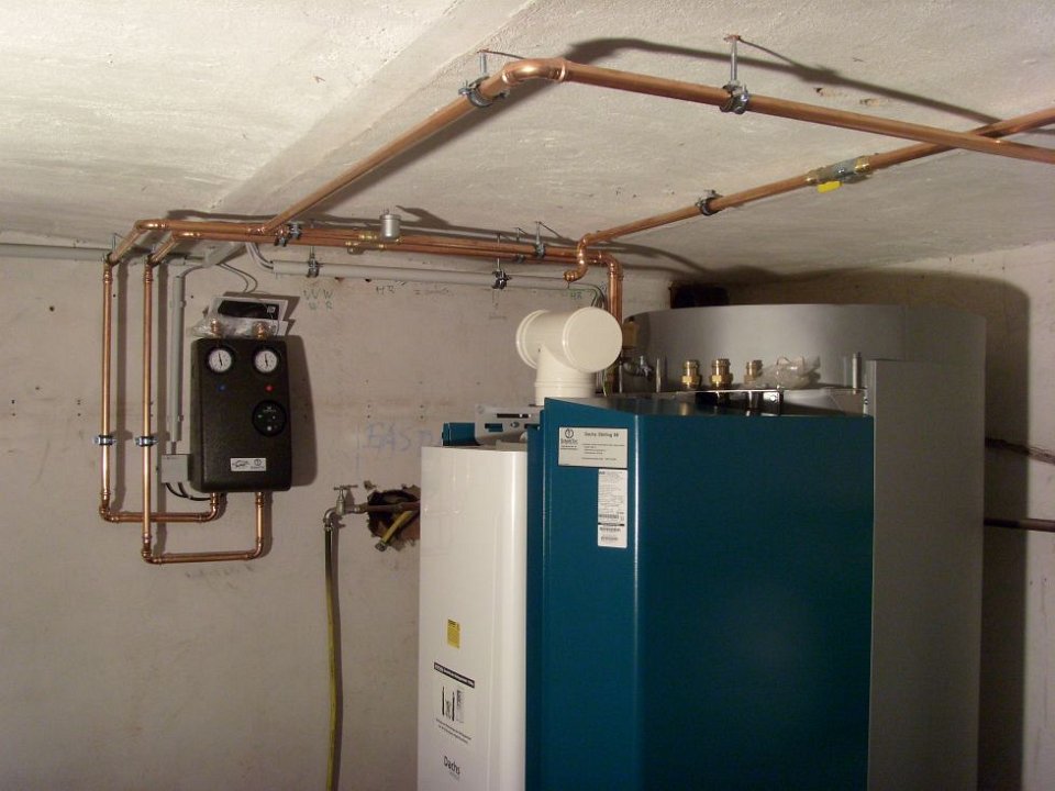 4 Ordentlich montiert, Heizungsverteiler (schwarzer Kasten) und Erdgaszufuhr (Rohr mit gelbem Absperrhahn). |
