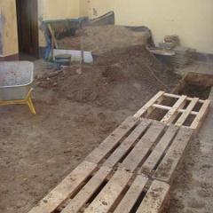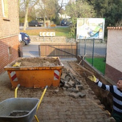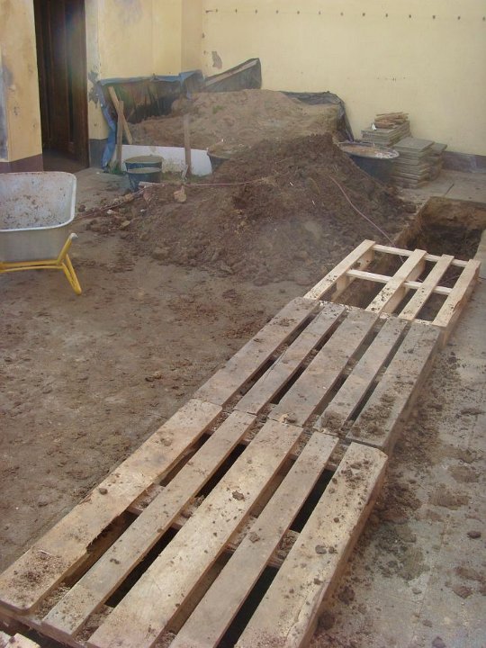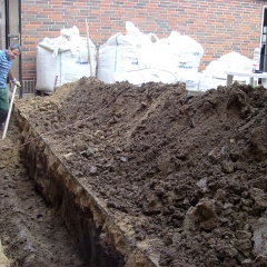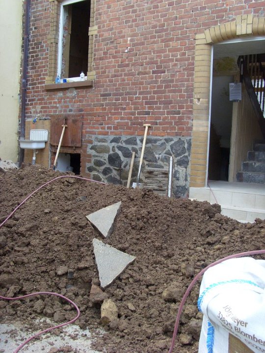 81 Schotter rein, damit der Dreck abgefahren werden kann. Das dicke Rohr ist unser neuer Revisionsschacht. |
